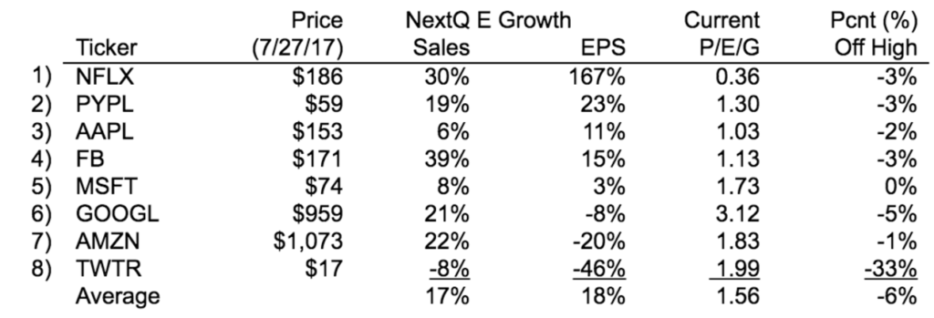Meanwhile, to that end, the table below shows the current next quarter growth forecast for sales and earnings for tech sector leaders along with the percentage decline of their shares from their respective 52-week highs and the P/E/G (price/earnings/growth rate) ratio contrasting the current 2018 P/E ratio with the EPS growth rate over the 2016-2018 timeframe. With possible concerns around economic growth, it is important investors consider those names where profit margins are expanding (i.e. EPS growth greater than sales growth) over names where profit margins are under pressure or where EPS are seeing outright declines. When faced with uncertainty, selectivity is critical to preserving capital and, along with it, performance.